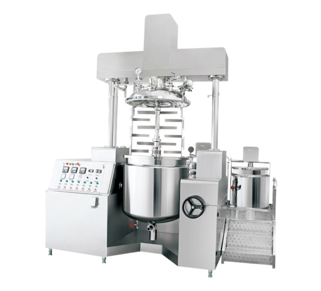 真空乳化機主要由水相鍋、油相鍋、乳化攪拌主鍋、真空系統、升降系統(可選)、電器控制系統(可選用PLC)、操作平臺等組成。